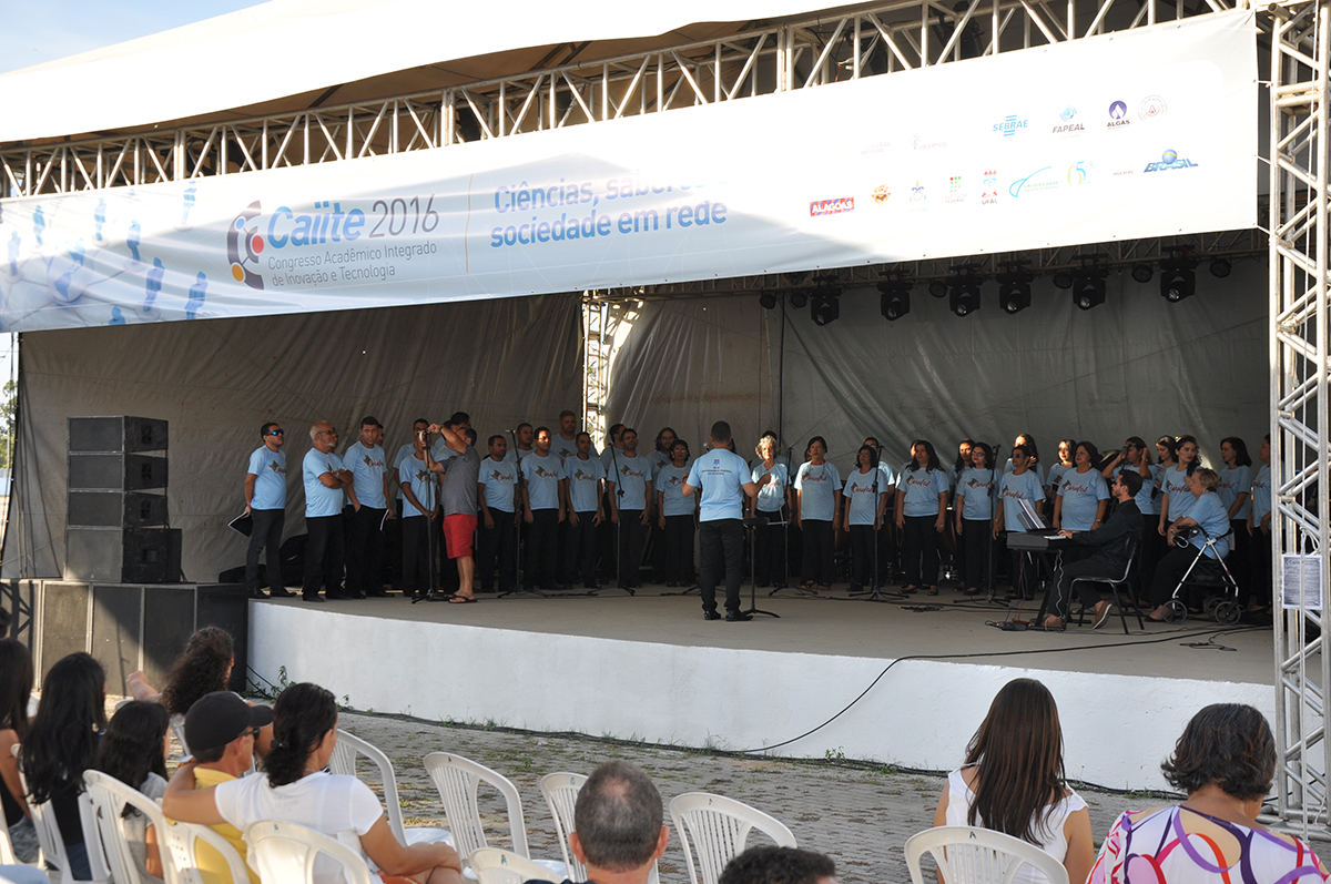 O Coro da Universidade Federal de Alagoas foi a primeira apresentação cultural do Congresso Acadêmico Integrado de Inovação e Tecnologia (Caiite 2016), nesta quinta-feira (8), num palco montado ao lado do Centro de Interesse Comunitário (CIC). Vânia Papini, com 17 anos de Corufal, se diz emocionada como se fosse a primeira apresentação: “É sempre emocionante, sempre tem músicas novas e sempre tem gente chegando. Eu acho que a gente cresce, canta e se sente bem!”, descreveu.
